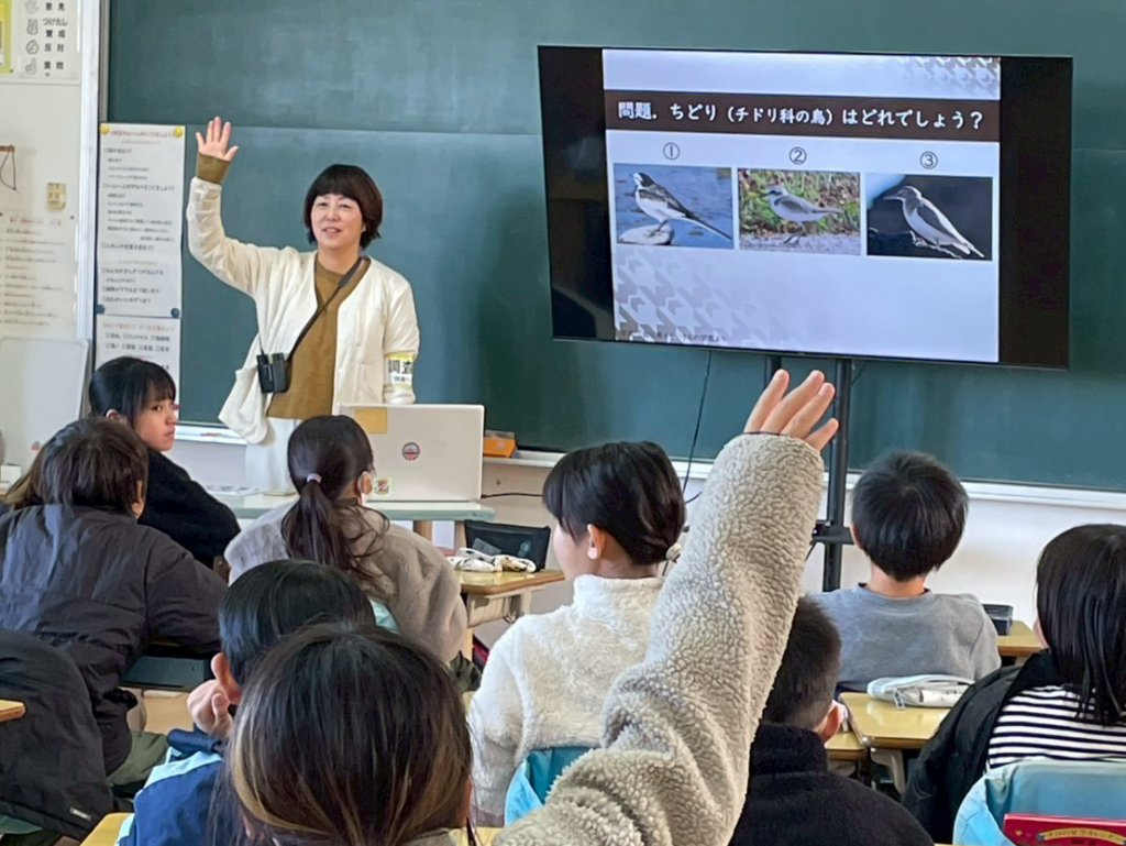 10月にビーチクリーンを予定している浦小学校。その事前学習として、前回は海の生きもの観察と漂流物の観察を行いました。漂流物はすべてがゴミではなく、生きもののすみかにもなっていることを学んだ子どもたち。今回はその続編として、2月3日に同じ浦海岸でシロチドリの観察授業を行いました。