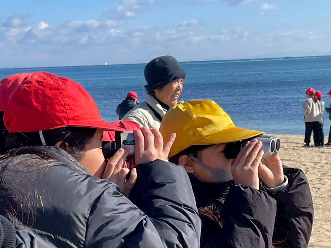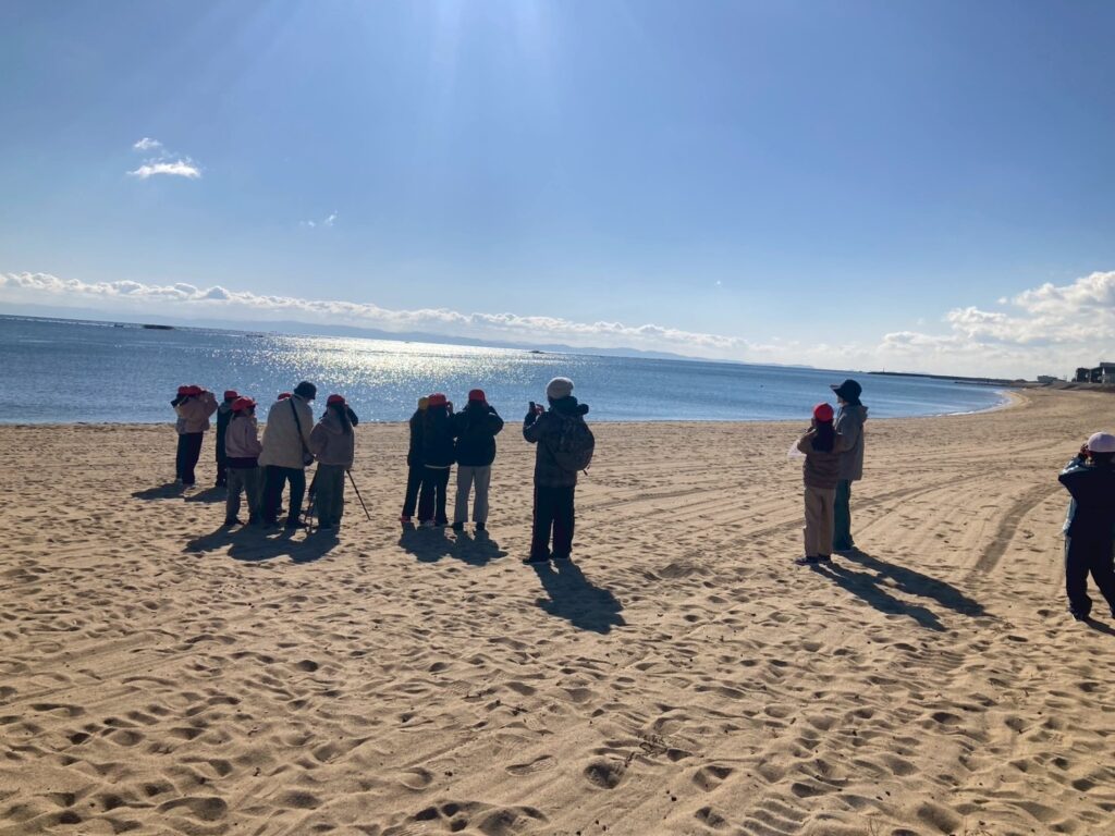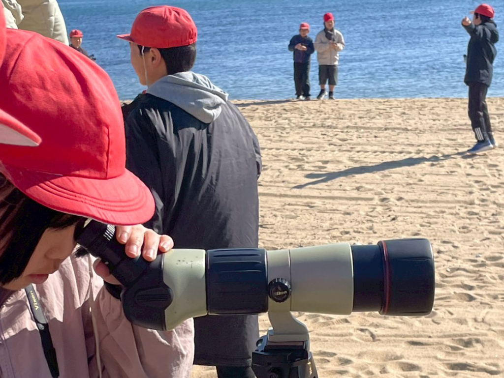 学校を出発し、浦海岸へ向かいます。浜に到着すると、まずは双眼鏡の使い方を練習しました。最初はピント合わせに苦戦していた子どもたちも、次第にコツをつかみ、砂浜の小さな動きに目を向けられるようになります。